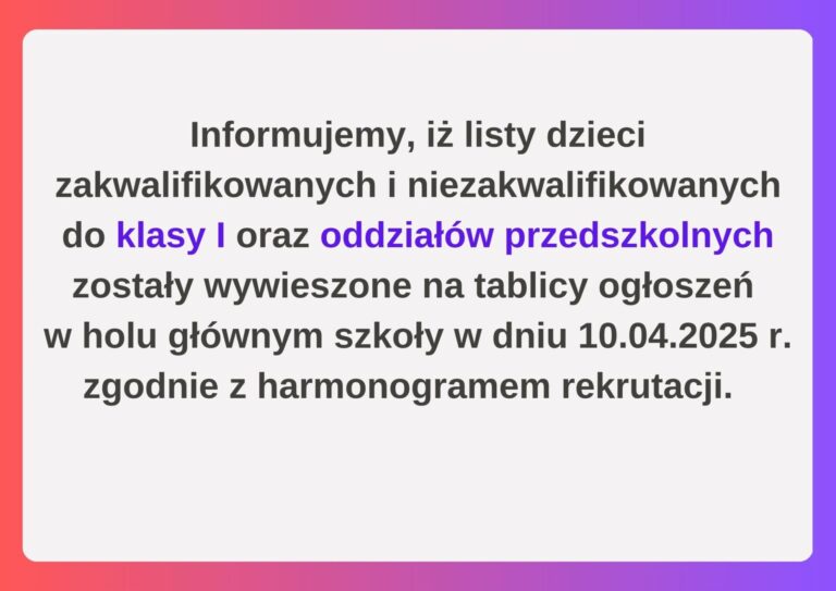 Wyniki rekrutacji klasa I oraz oddziały przedszkolne – Informacja