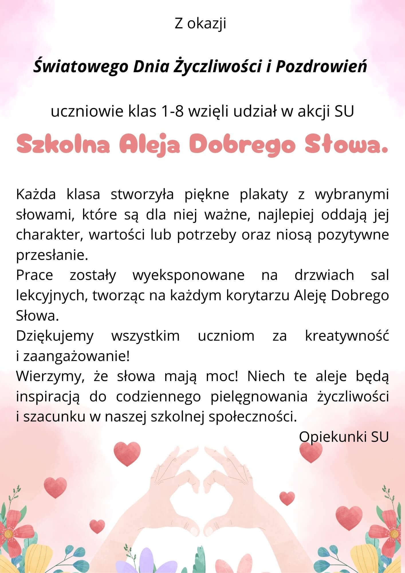 Uczniowie klas 1-8 wzięli udział w wyjątkowej akcji, której celem było promowanie życzliwości i najważniejszych wartości. Dzięki wykonanym przez nich plakatom nasze szkolne korytarze zamieniły się w inspirujące Aleje Dobrego Słowa!