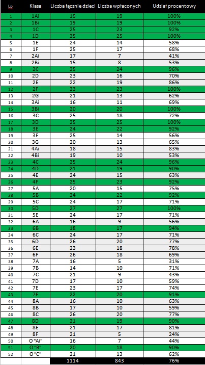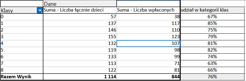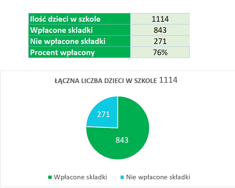 - 2022 r. – 26% wpłat z całej szkoły do maja (konieczna była pilna pomoc Dyrekcji na koniec roku szkolnego, która przyniosła efekt wzrostu),