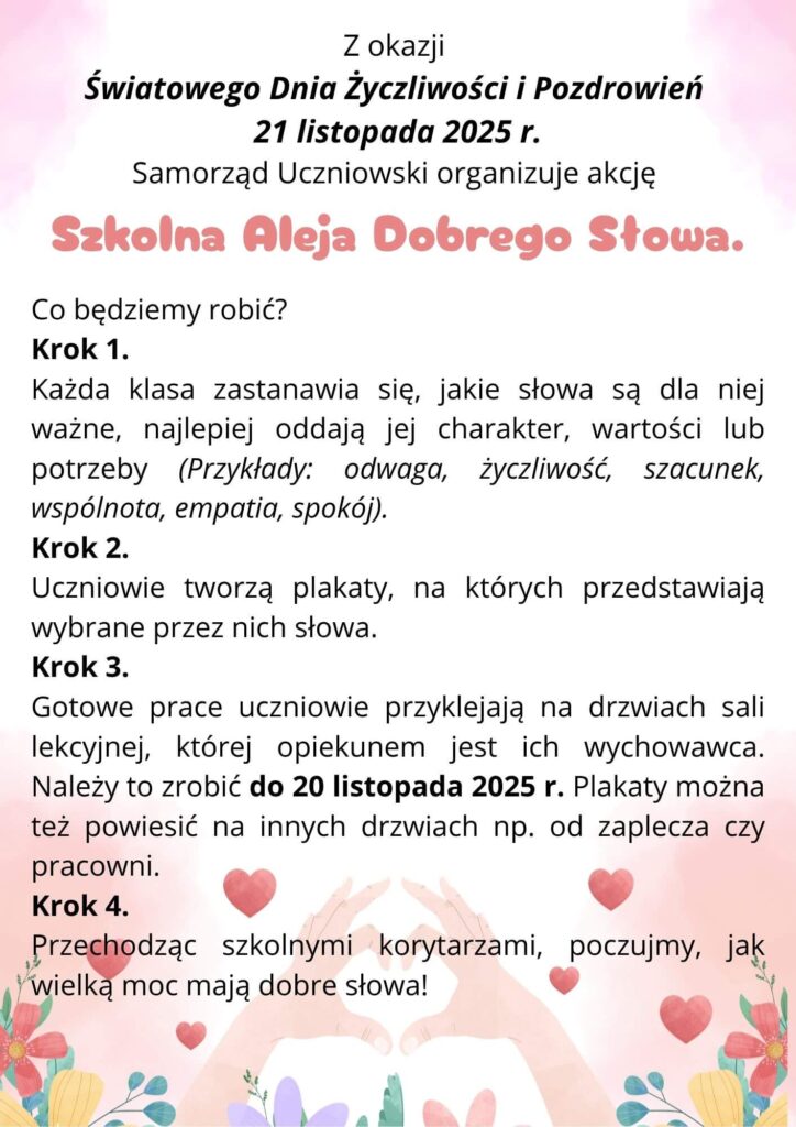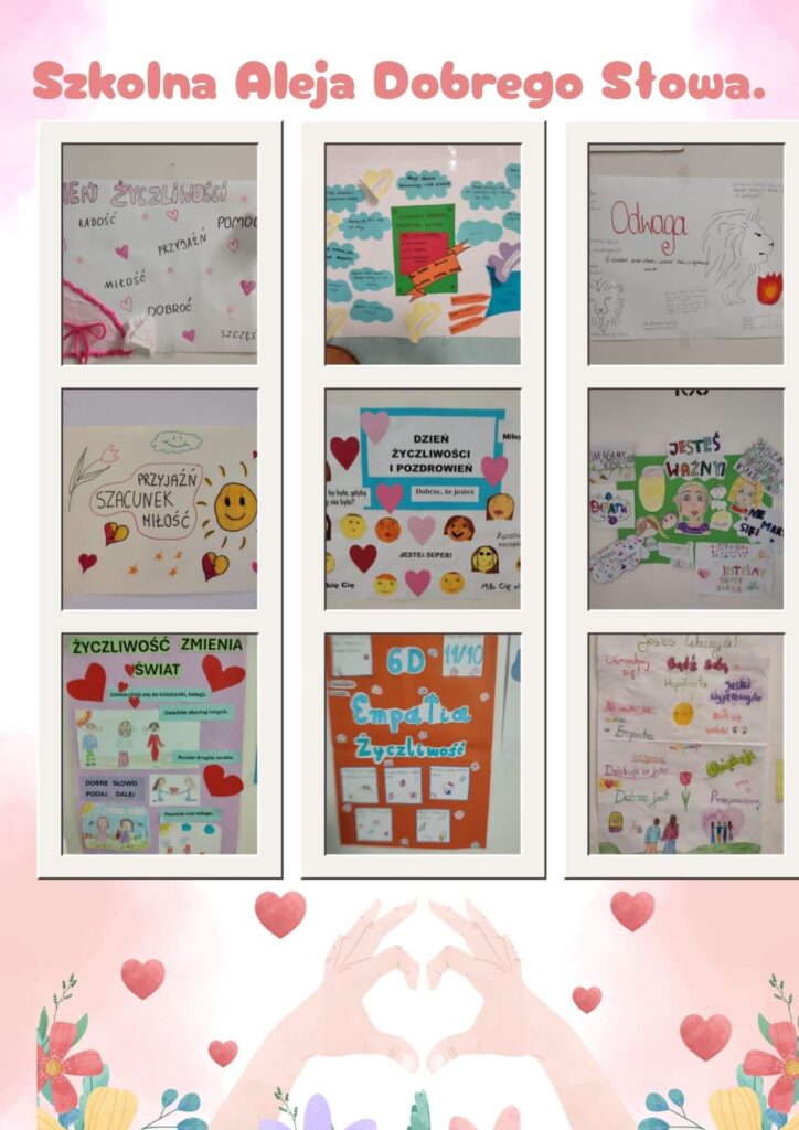 Uczniowie klas 1-8 wzięli udział w wyjątkowej akcji, której celem było promowanie życzliwości i najważniejszych wartości. Dzięki wykonanym przez nich plakatom nasze szkolne korytarze zamieniły się w inspirujące Aleje Dobrego Słowa!Dziękujemy wszystkim za udział i zaangażowanie.Opiekunki SU. Kampania Społeczna SŁOWA mają MOC.
