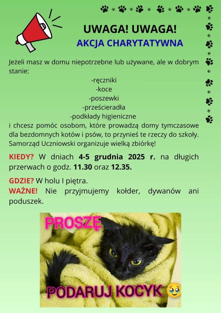 Z okazji Międzynarodowego Dnia Wolontariusza Samorząd Uczniowski zachęca do udziału w akcji charytatywnej na rzecz bezdomnych kotów i psów. Zbiórki odbędą się w dniach 4-5 grudnia 2025 r. Szczegóły na plakacie.